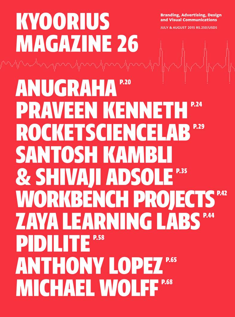 Kyoorius is a bi-monthly print magazine on visual communications. Subscribe here. For buying a single copy (or any of the previous issues), write to us at subs@kyoorius.com. You can order the issue from Tadpole and Paper Planes, get the digital copy from Magzter and also buy it from bookstores near you. For any feedback on the magazine or to submit your work, do drop in a mail to us at editor@kyoorius.com. Follow us on Facebook and Twitter.